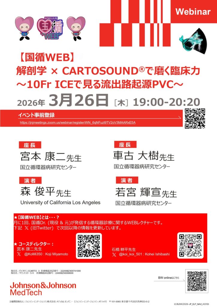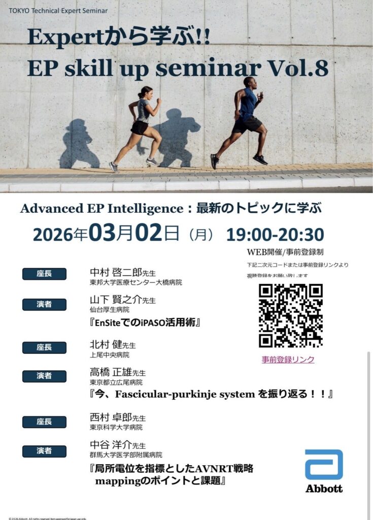 ホームウェブセミナー 2026年03月開催のWebセミナー 日本不整脈心電学会の公式Youtubeが始まりました! 視聴、チャンネル登録をよろしくお願いします! 目次 2026年03月02日(月) 演者からのメッセージ 2026年03月26日(木) 演者からのメッセージ 2026年03月02日(月) 登録はこちらから 演者からのメッセージ 告知です♪ EP skill up seminar Vol 8Purkinje systemを本気で語れますか?AVNRTにおける局所電位の本質は?PFA時代におけるNon-PV fociの治療戦略は?第一線で活躍するエキスパートが、実践レベルで徹底解説3/2(月)19:00–20:30EP skill up seminar Vol.8#EP #アブレーション pic.twitter.com/kkN18delAE— Keijironakamura (@TohoOhashiEP) February 23, 2026 登録はこちらから 2026年03月26日(木) 登録はこちらから 演者からのメッセージ 【3/26(木)19時~ 解剖学×10Fr CARTOSOUNDで磨く臨床力】10Fr心腔内エコーは、どこまで“真の解剖”に迫れるのか?解剖学的理解を武器に、CARTOSOUNDを使いこなし、ワンランク上の臨床力へ😁ご登録はこちらからhttps://t.co/7sa94exzDT pic.twitter.com/D32P4kN3Yj— Koji Miyamoto (@KoMi350) February 24, 2026 登録はこちらから