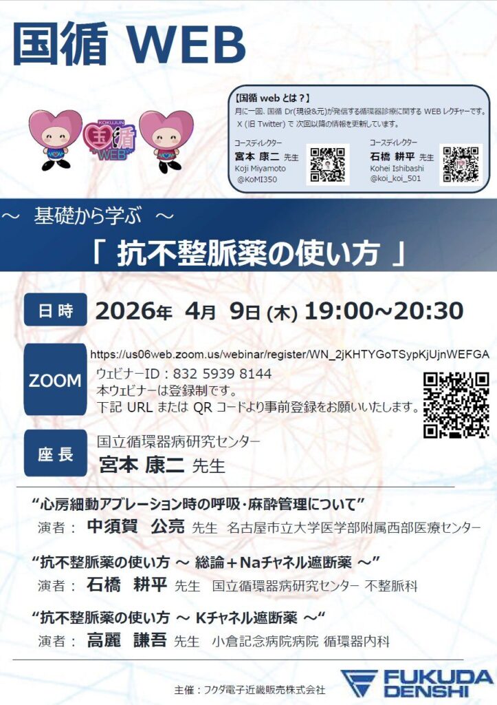 ホームその他 2026年04月開催のWebセミナー 日本不整脈心電学会の公式Youtubeが始まりました! 視聴、チャンネル登録をよろしくお願いします! 目次 2026年04月03日(金) 演者からのメッセージ 2026年04月09日(木) 演者からのメッセージ 2026年04月16日(木) 演者からのメッセージ 2026年04月03日(金) 登録はこちらから 演者からのメッセージ 来月ですが4/3に素敵な講演を座長するチャンスをいただきました。素敵な上司@MichifumiTokuda @Koichi16423232の元、最高の論文を仕上げた優秀な二人から・論文の詳細✨・言いたかったこと🔥・言えなかったことまで徹底的に教えていただこうと思います。登録↓https://t.co/aXex5DDREH pic.twitter.com/9Toql9dwOI— Yasuharu Matsunaga-Lee@EP Univ. School of Mapping (@Yasuharu_ML) March 19, 2026 登録はこちらから 2026年04月09日(木) 登録はこちらから 演者からのメッセージ 【国循WEB 基礎から学ぶ「抗不整脈薬の使い方」】日時:2026年4月9日(木)19:00-20:30登録URL:https://t.co/OFn9USo9t9内容:国循WEB人気企画が帰ってきます!名古屋市立大学の中須賀先生にアブレーション時の呼吸・麻酔管理を、小倉記念病院の高麗先生には今回はK遮断薬をご担当いただきます! pic.twitter.com/7ODaMVVjRr— Kohei Ishibashi (@koi_koi_501) March 26, 2026 登録はこちらから 2026年04月16日(木) 登録はこちらから 演者からのメッセージ 【4/16(木)19時~ FARAPULSE・コンタクトセンシング 】FARAPULSEの新機能「コンタクトセンシング」についてお話します!きっと明日からの臨床に役立ちます😁ぜひご視聴くださいhttps://t.co/zjWVWoMhj4— Koji Miyamoto (@KoMi350) March 31, 2026 登録はこちらから